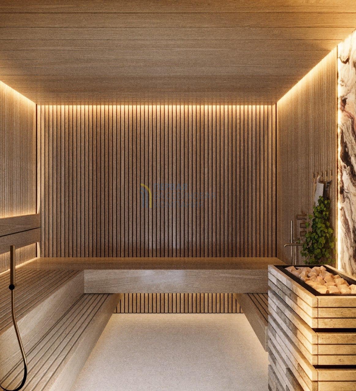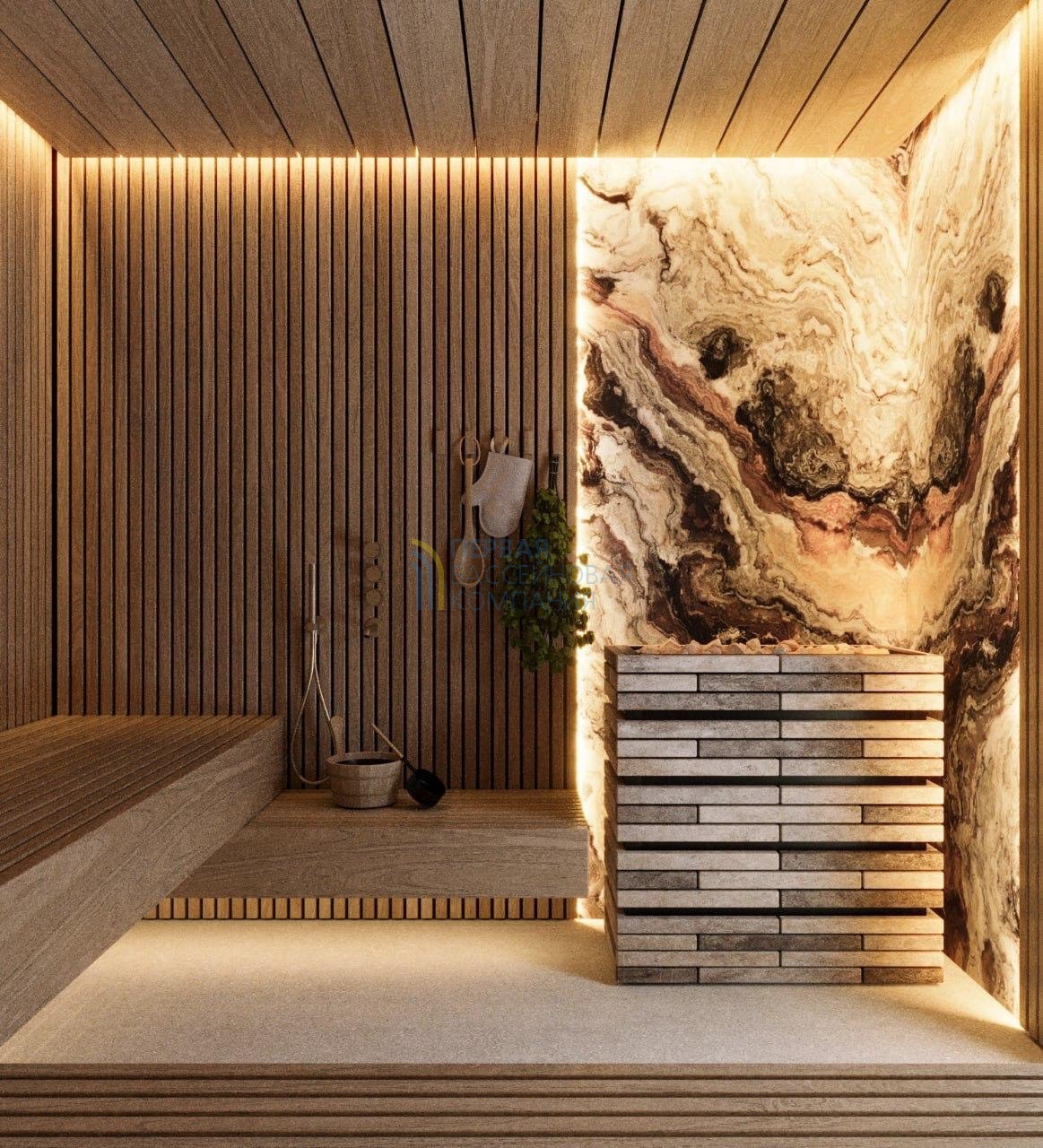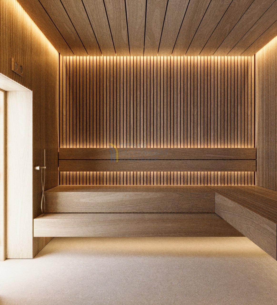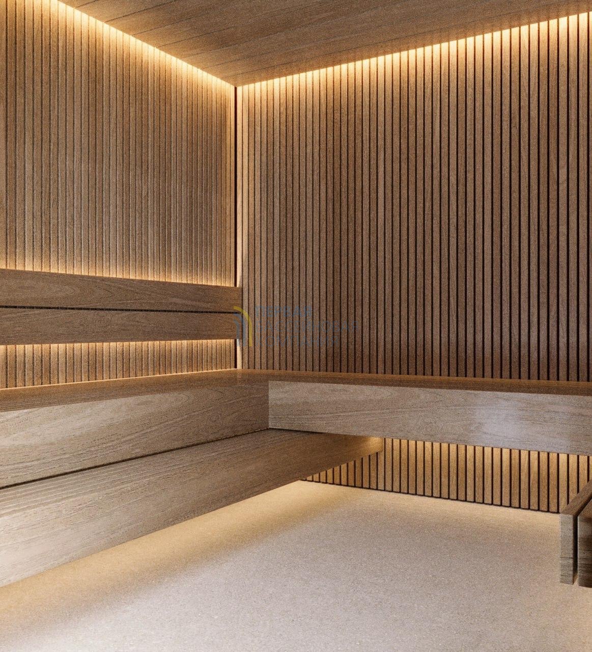 1. Материал отделки сауны - термоабаш или термоольха в зависимости от выбора клиента.