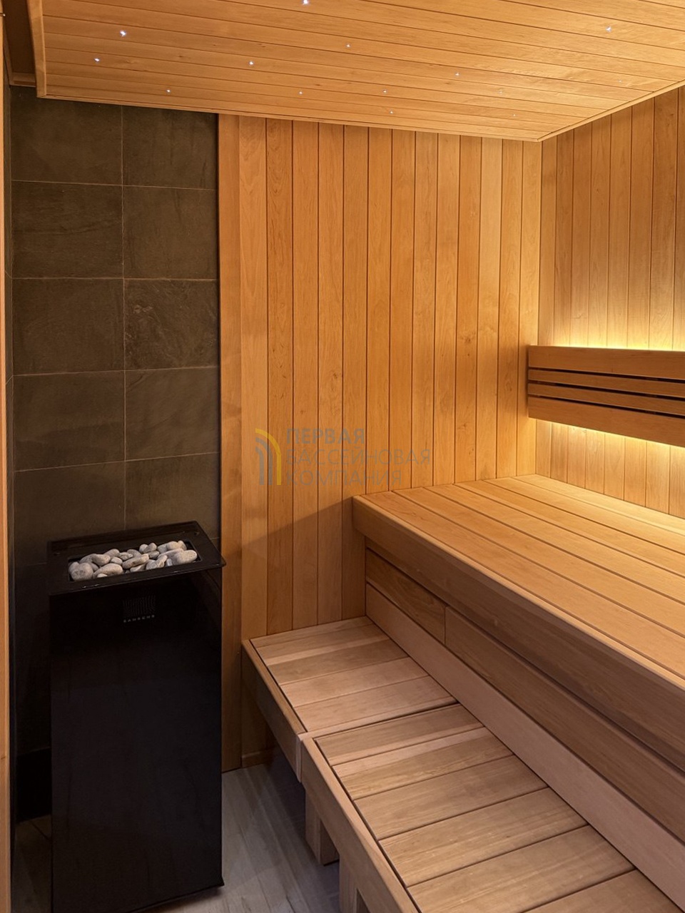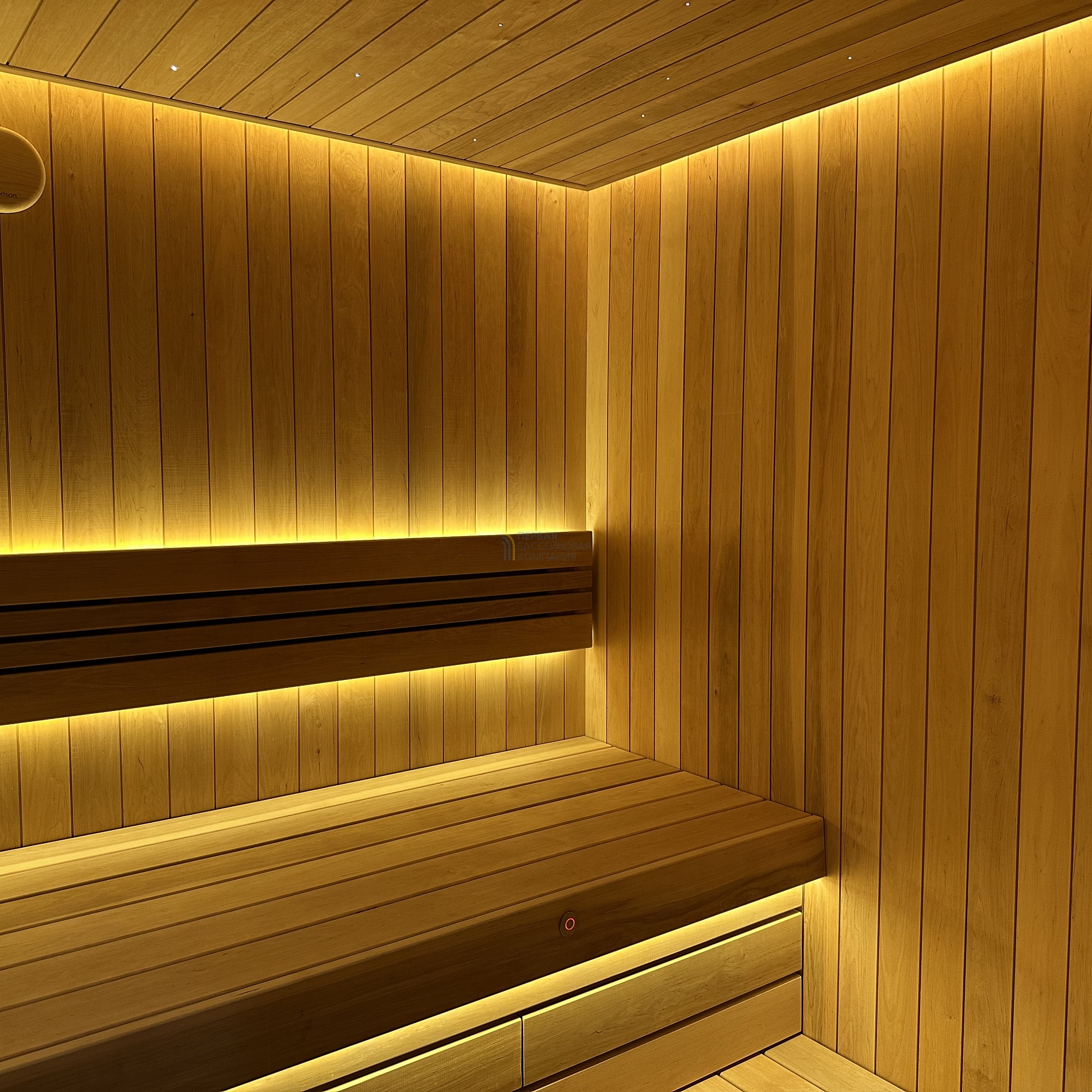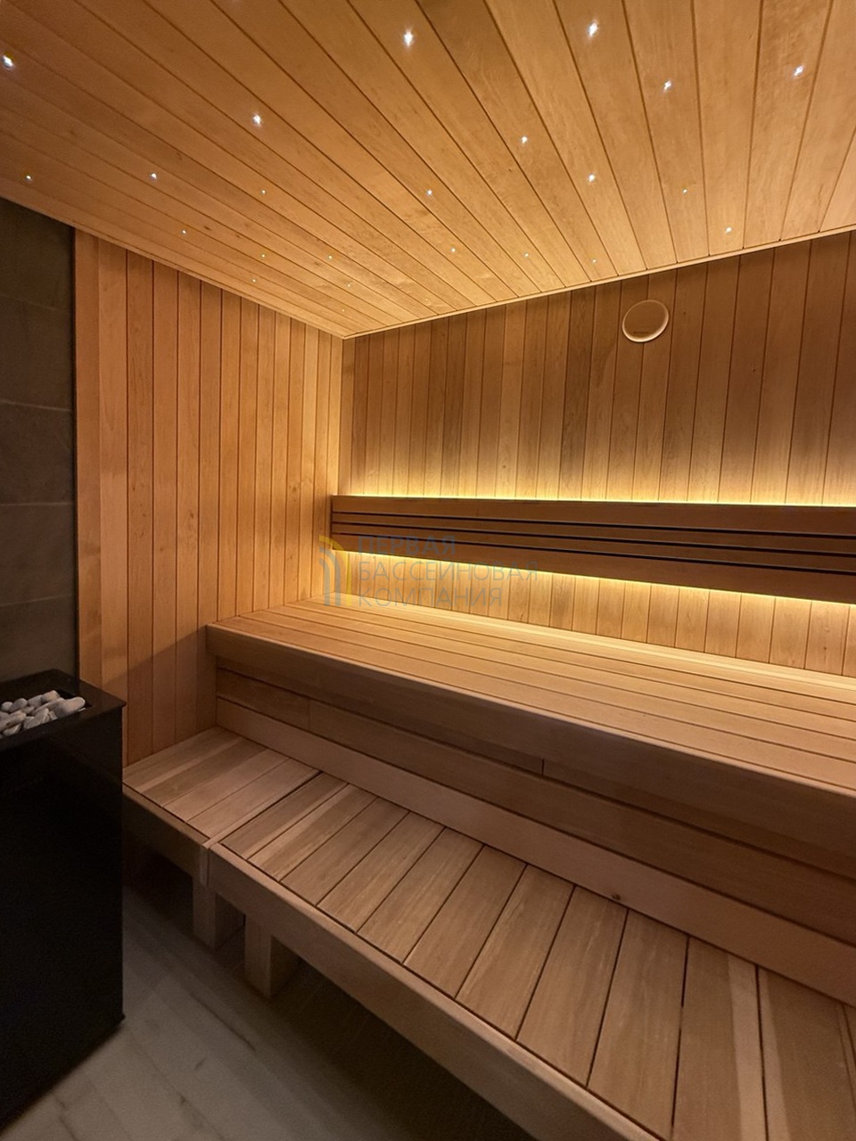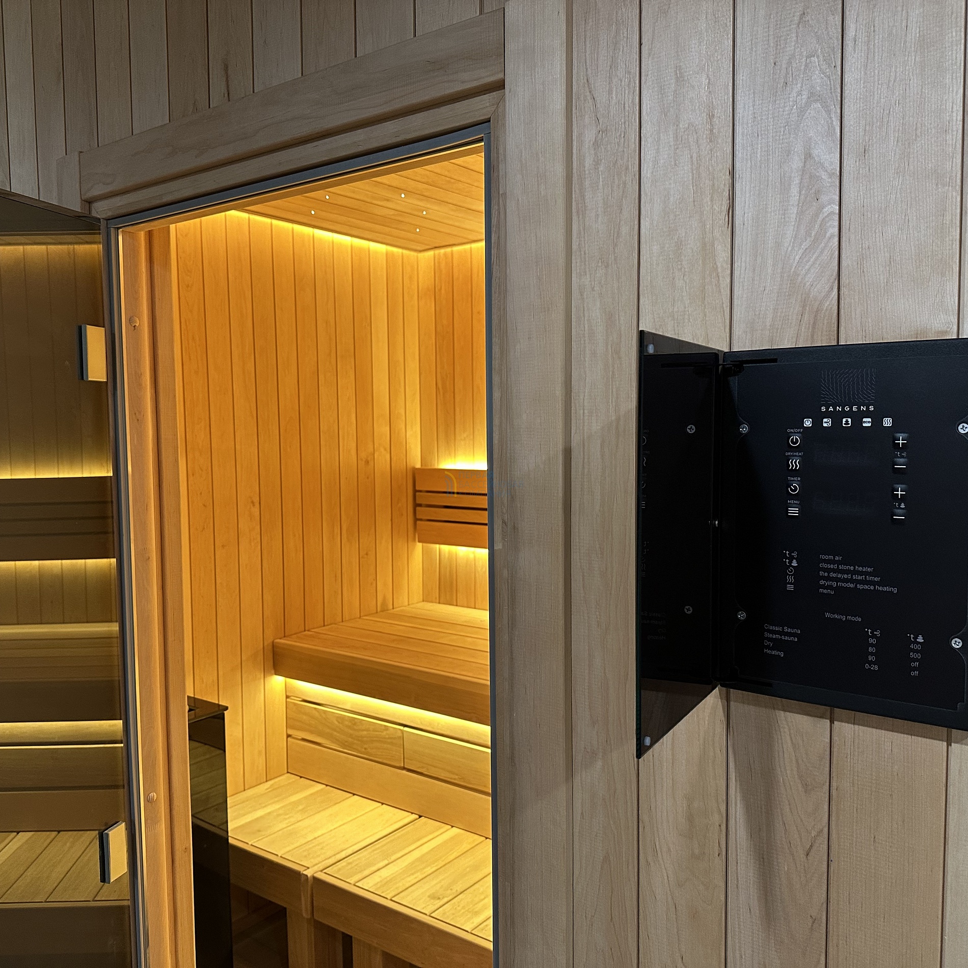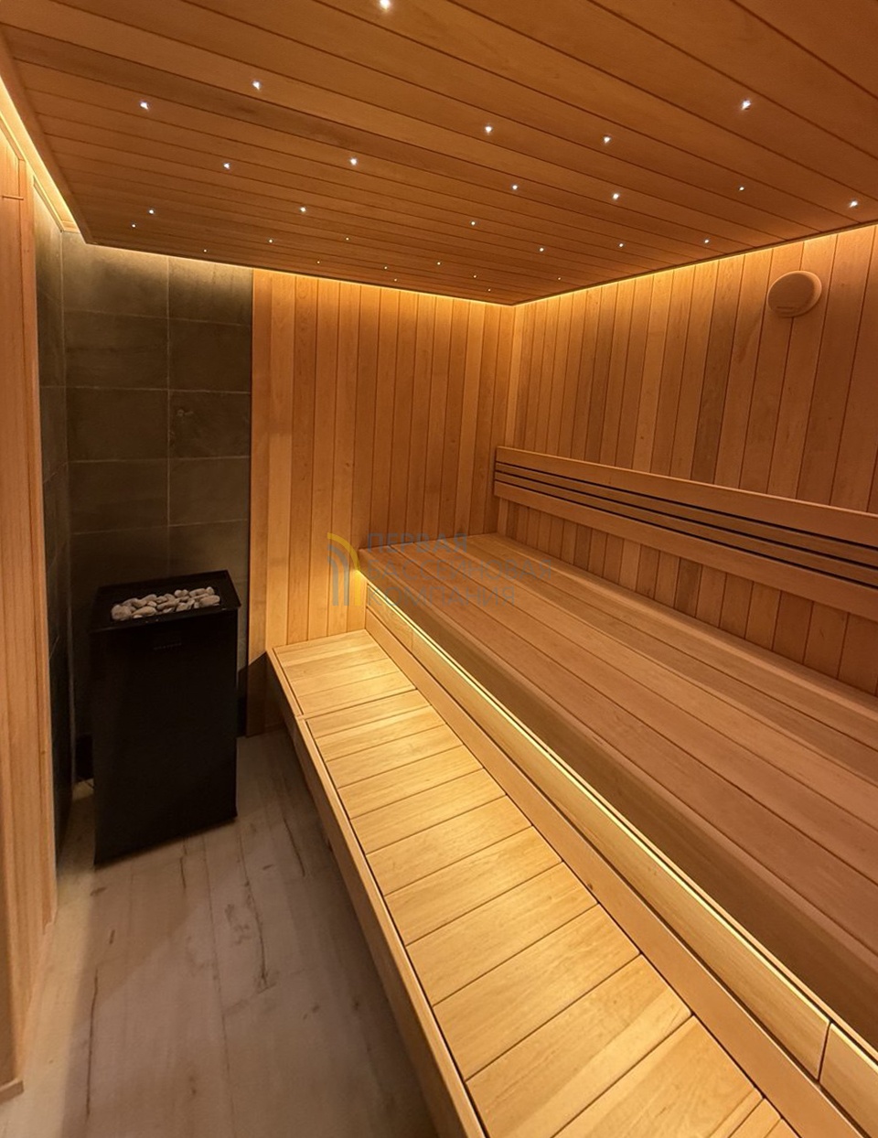 Особенностью сауны является автоматическая подача воды на камни.